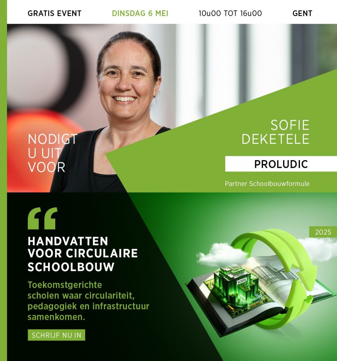 Kom naar het inspiratie-event ‘Handvatten voor circulaire schoolbouw‘ van Schoolbouwformule. Onze eigen Sofie Deketele is hier aanwezig!