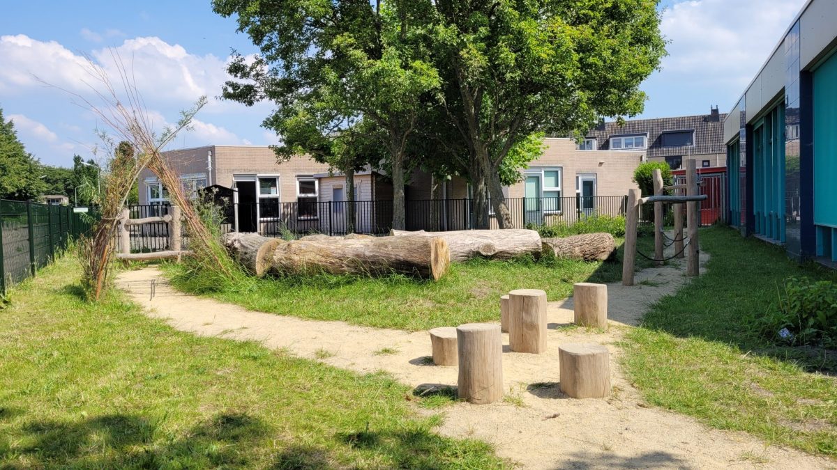 De wens van basisschool CBS Tabitha was de gehele buitenruimte een natuurlijke uitstraling te geven. De lange groenstrook aan de zijkant van de school was een gedeelte waar weinig gebruik van werd gemaakt. Ons ontwerp voor een slingerparcours sprak de school erg aan. Deze speelroute geeft een mooie uitdaging aan de kinderen door de evenwichtsbalken, stappaaltjes, speelkeien en wiebel loopbrug. Stichting Meer Primair heeft een budget vrij kunnen maken voor de aanpak van deze buitenruimte.