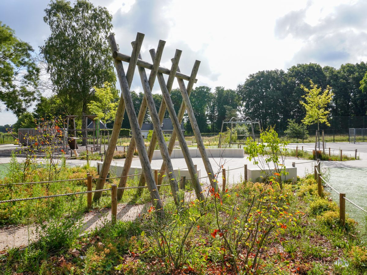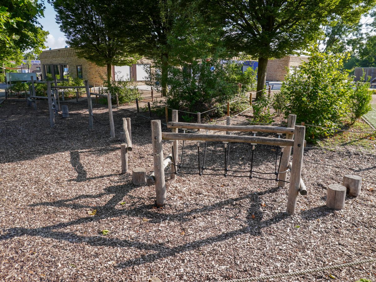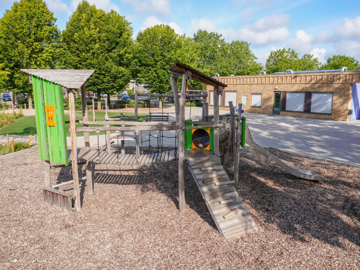 Er is een mix van natuurlijke speelelementen, zoals houten klimtoestellen, een klauterparcours en een insectenhotel, gecombineerd met open speelruimte. De beplanting en grasvelden zorgen voor een prettige, rustige sfeer, terwijl de speeltoestellen uitdagen tot klimmen, glijden en balanceren. De buitenklas met zitranden biedt ruimte voor buitenlessen of gezamenlijke activiteiten. Het plein nodigt uit tot spel, samenwerking en leren in de buitenlucht.