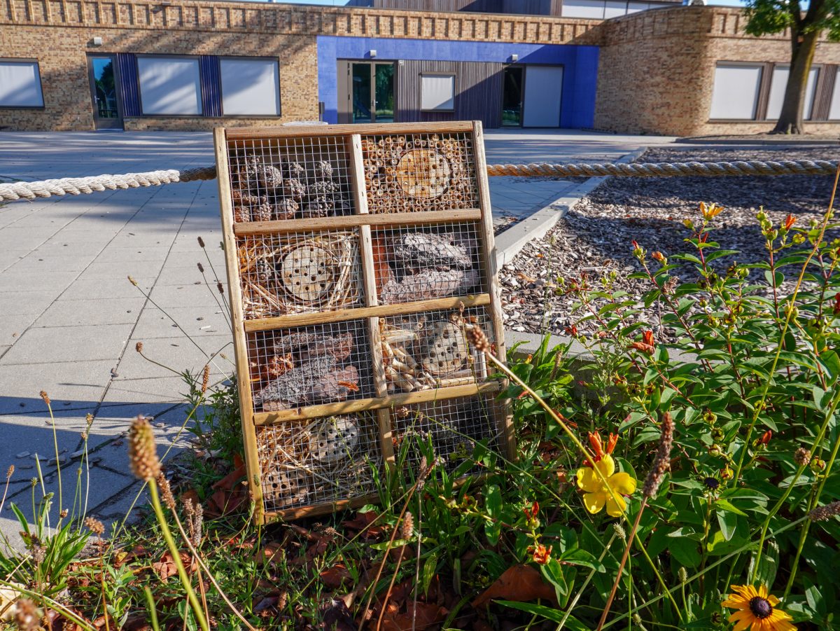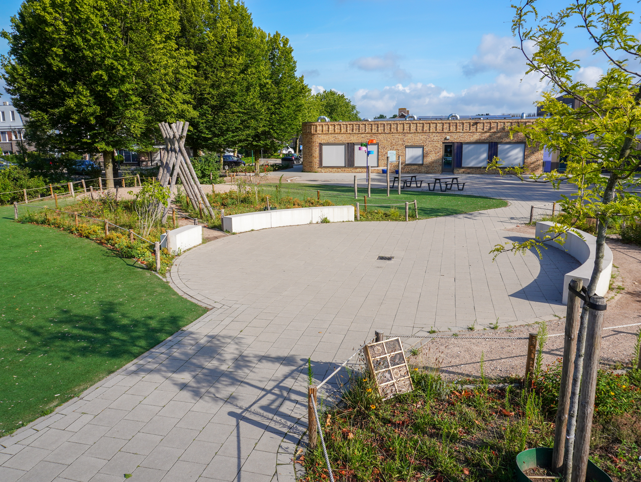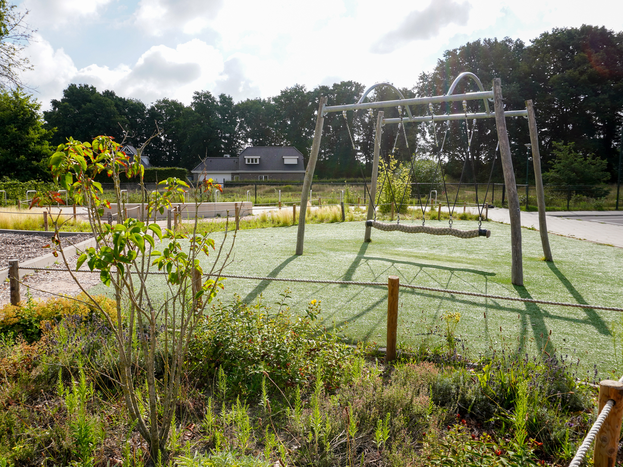 Er is een mix van natuurlijke speelelementen, zoals houten klimtoestellen, een klauterparcours en een insectenhotel, gecombineerd met open speelruimte. De beplanting en grasvelden zorgen voor een prettige, rustige sfeer, terwijl de speeltoestellen uitdagen tot klimmen, glijden en balanceren. De buitenklas met zitranden biedt ruimte voor buitenlessen of gezamenlijke activiteiten. Het plein nodigt uit tot spel, samenwerking en leren in de buitenlucht.