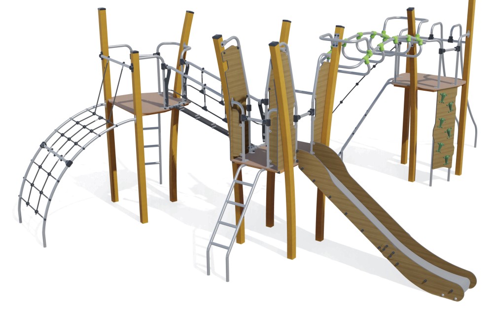 De Kanopé speelcombinatie is een speeltoestel vol avontuur, uitdaging en beweging. Kinderen klimmen, glijden, balanceren en ontdekken samen in een natuurlijk ogend ontwerp. Met plek voor maar liefst 33 kinderen tegelijk is dit toestel ideaal voor dynamische speelomgevingen. Duurzaam, robuust en ontworpen voor urenlang speelplezier. Naast het toestel staat een duikelrek: perfect om te hangen, draaien of kunstjes te oefenen.