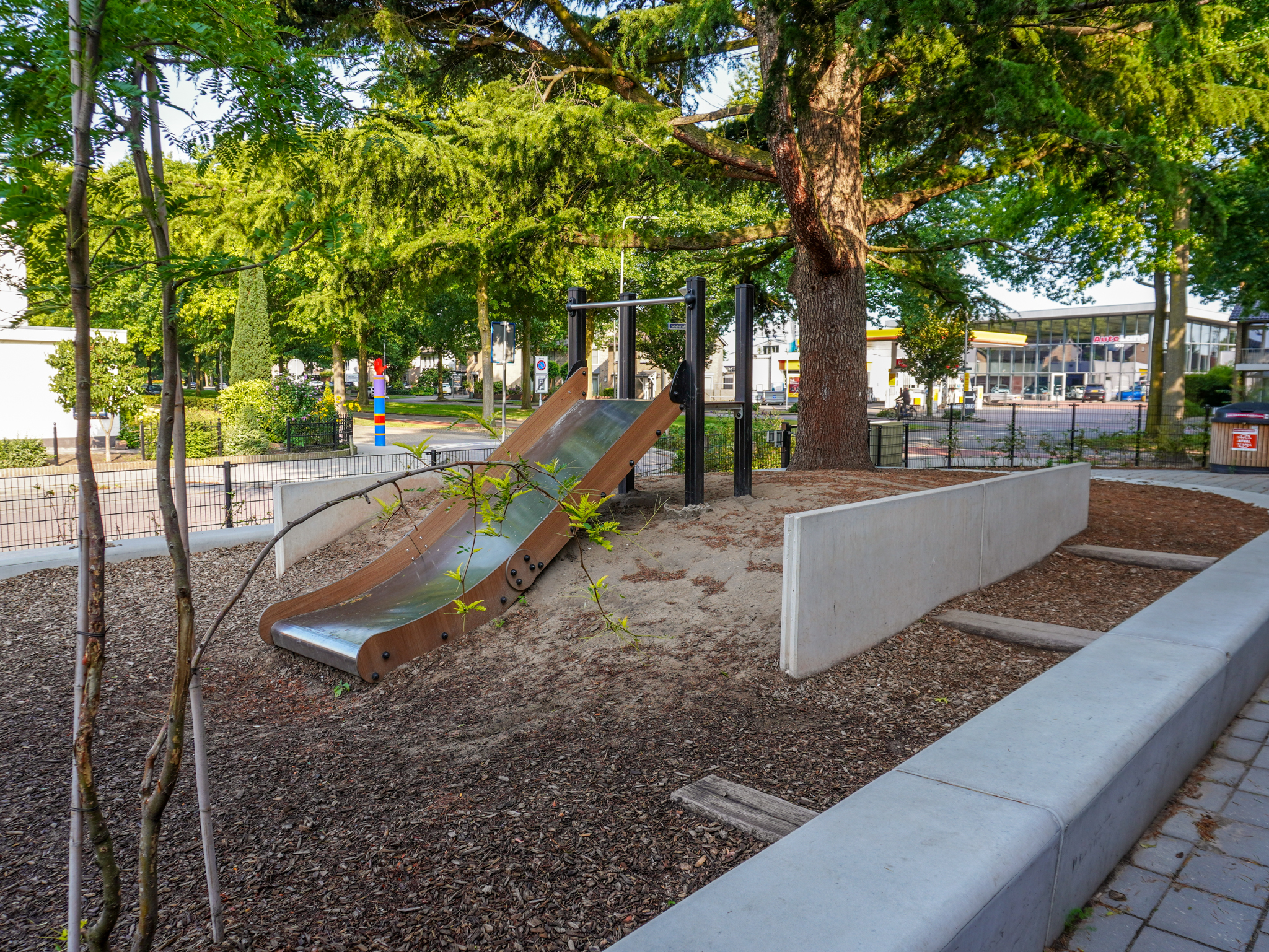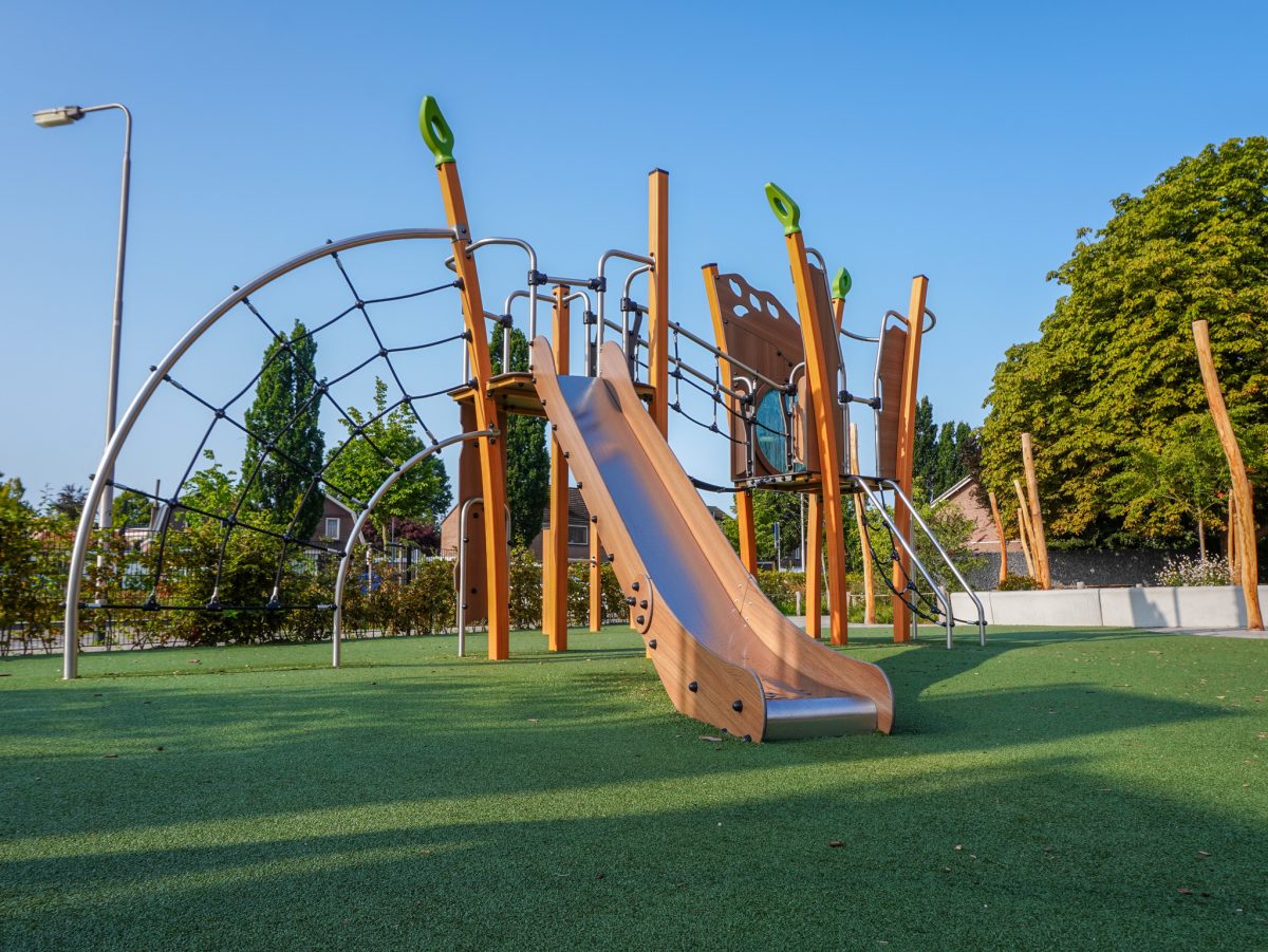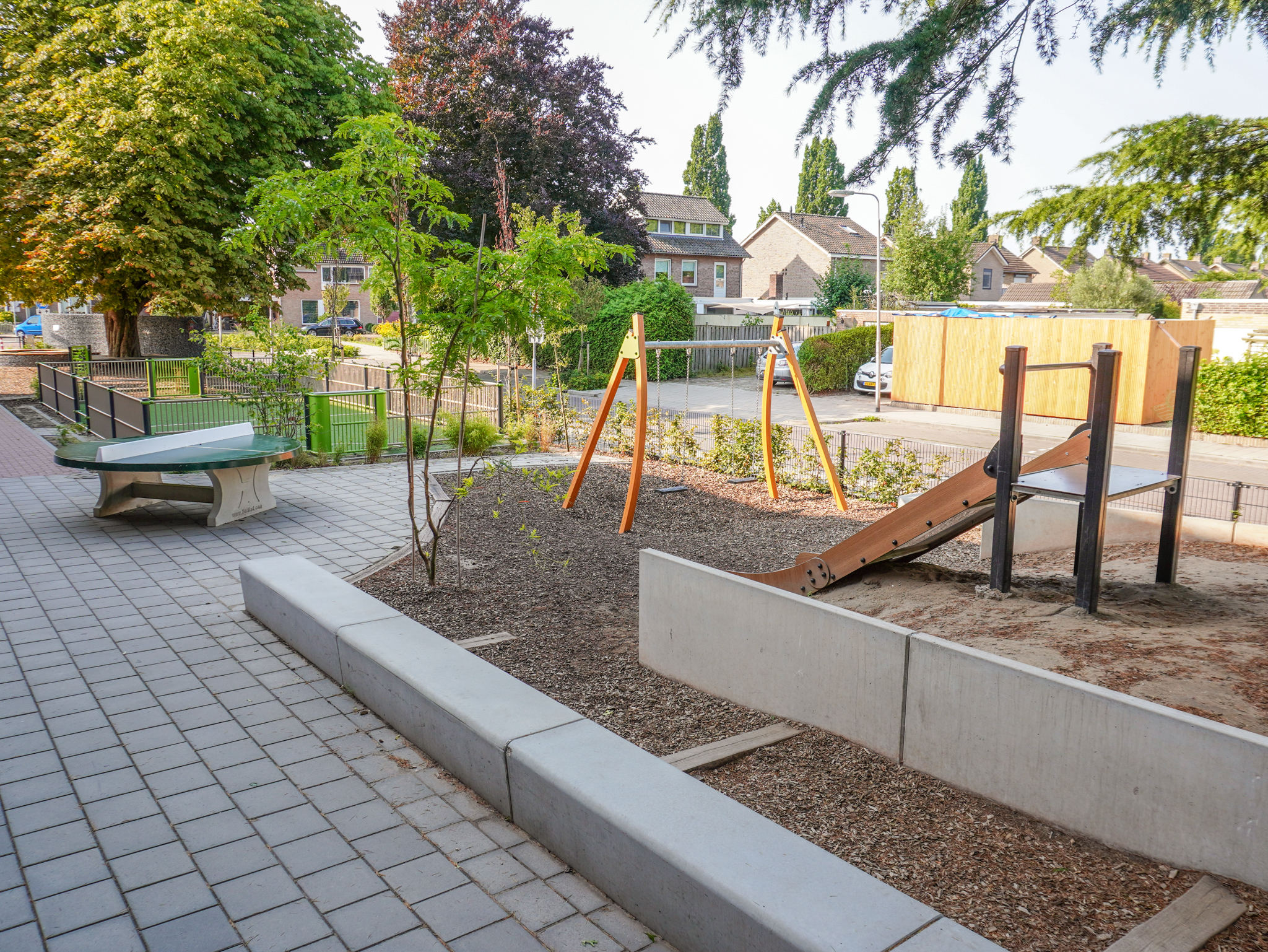 De kinderen hebben heel actief meegedacht over het plein, met moodboards en ideeën uit de klas. Ze reageren heel leuk en positief op het plein. Er kan een brede variëteit gespeeld worden van jong tot oud. Leuke glijbanen, een fantastische touwschommel en duikelrekken, het biedt echt de uitdaging waar kinderen naar zochten.”