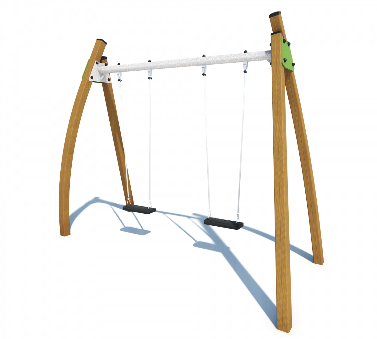 J432-C Schommel met 2 standaardzitjes – Een klassiek speeltoestel dat beweging en balans stimuleert. De robuuste houten look geeft een natuurlijke uitstraling en past perfect in de groene omgeving.