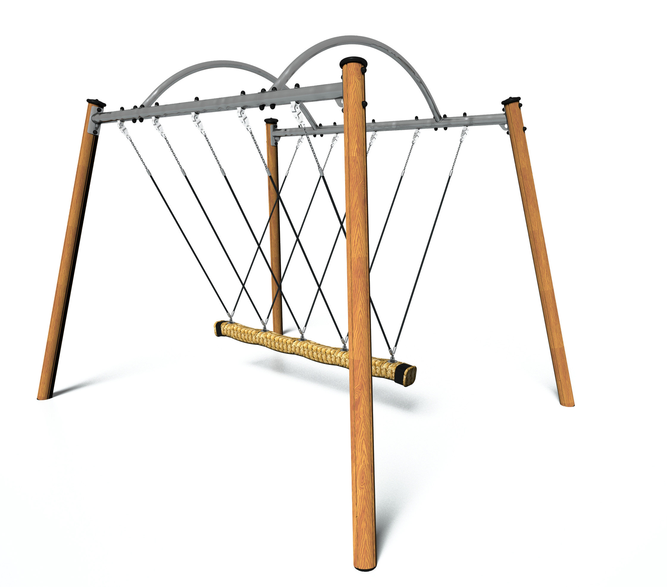 J442 Familieschommel – Samen schommelen op één groot touw bevordert samenwerking en plezier. Het ontwerp daagt kinderen uit om hun evenwicht te bewaren en elkaar te helpen.