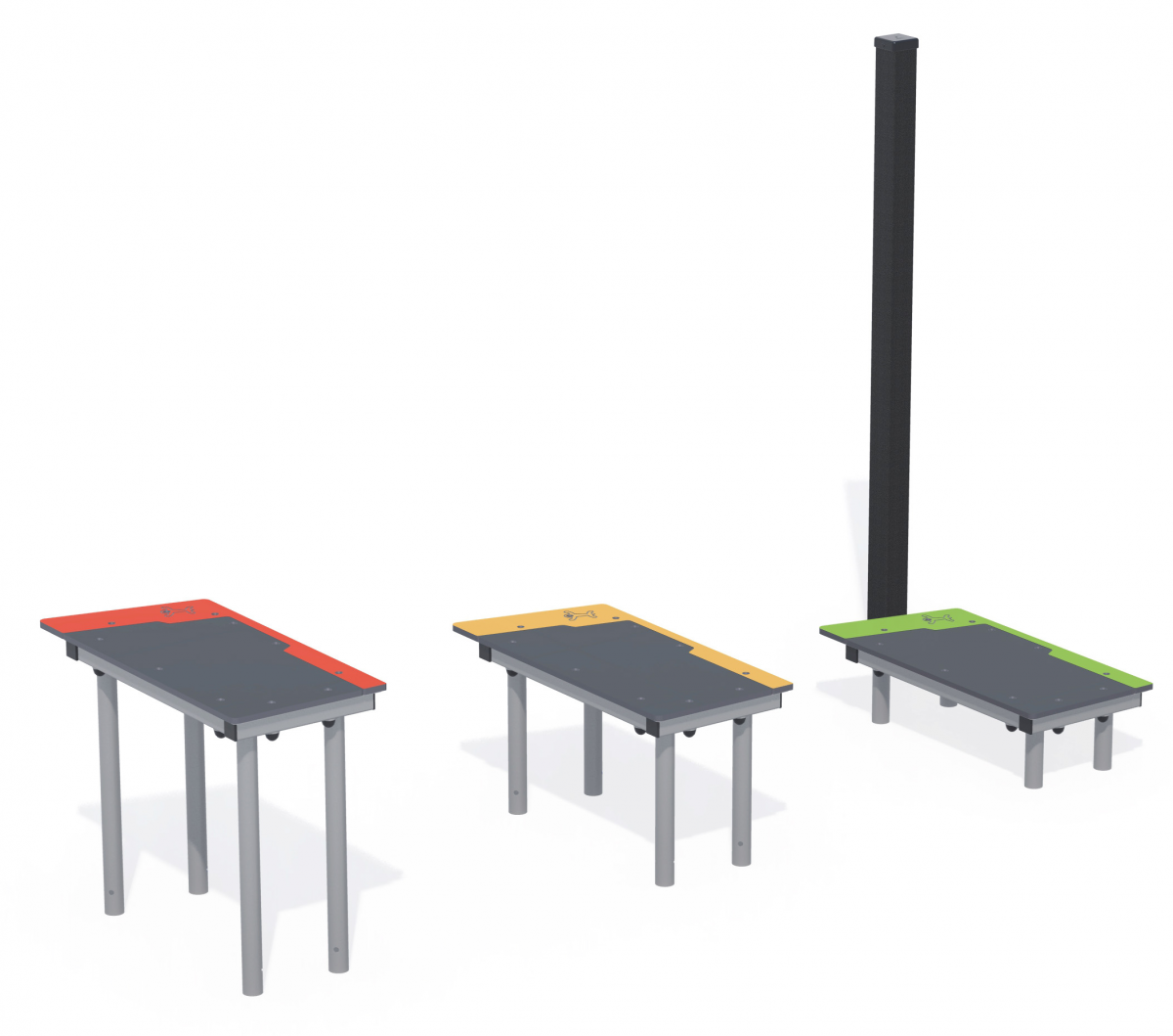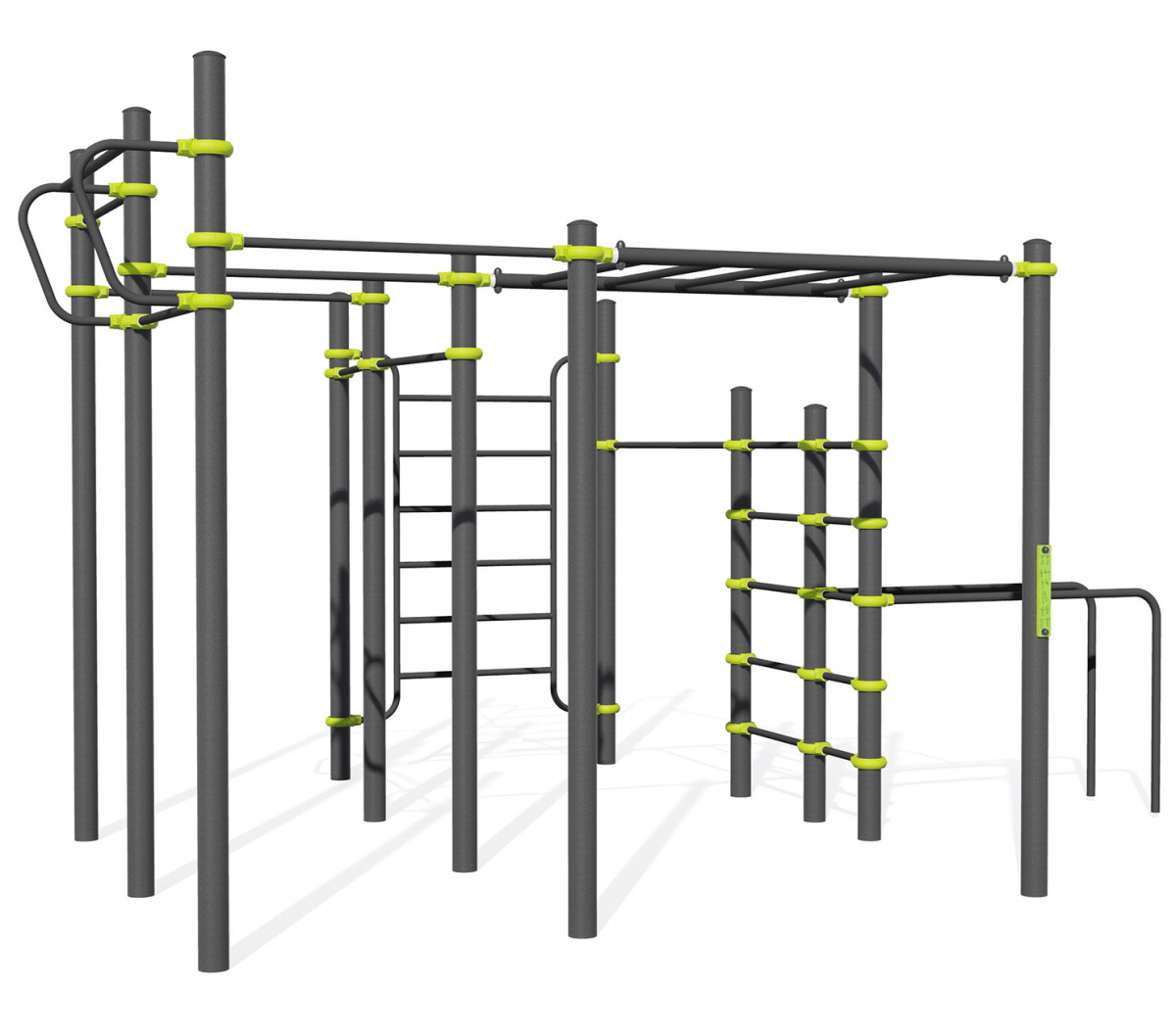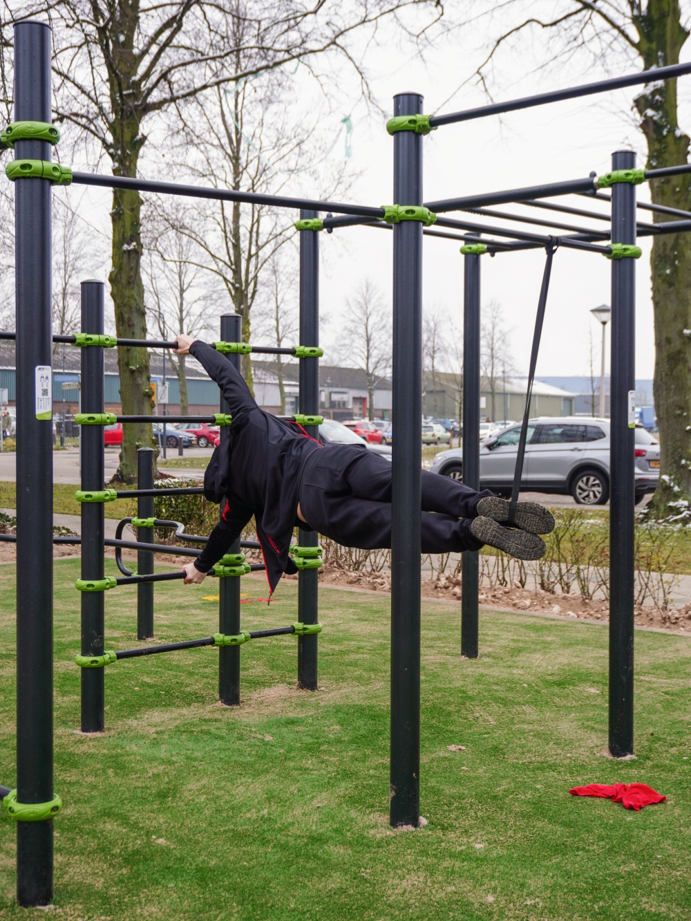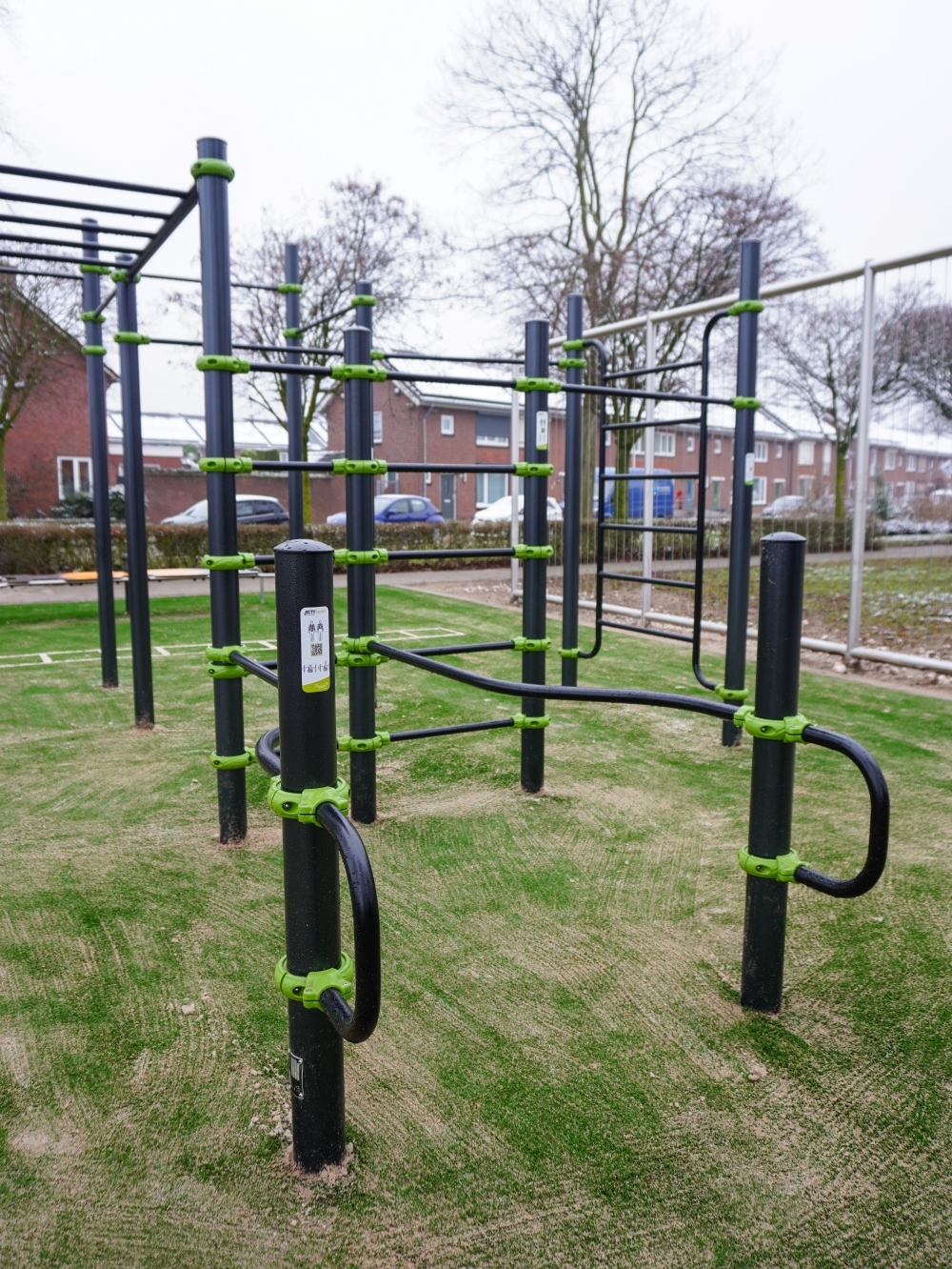 De calisthenics-opstelling bestaat uit een veelzijdige combinatie van toestellen die samen een complete training mogelijk maken. Monkeybars en klimstructuren dagen uit op het gebied van kracht, grip en coördinatie. Steps en een buikspierbankje bieden ruimte voor gerichte core- en stabiliteitsoefeningen. Door deze variatie ontstaat een compacte sportplek die geschikt is voor zowel korte trainingsmomenten als intensieve workouts.