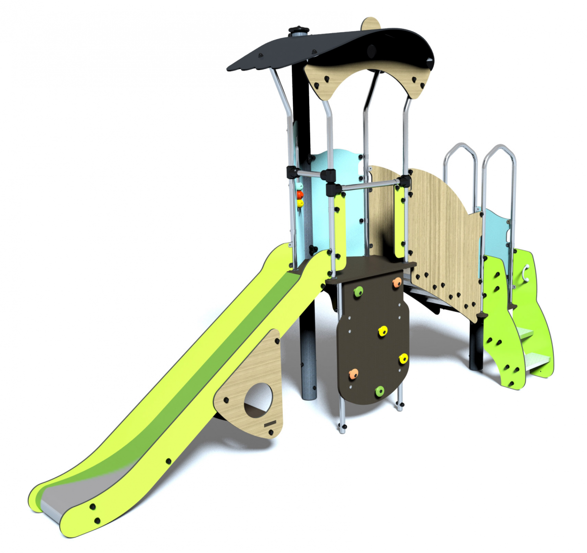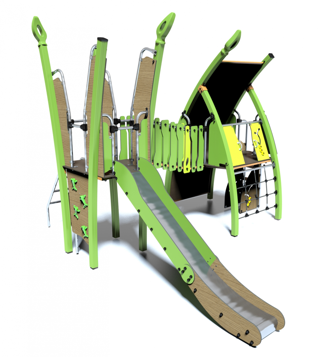 J5604 Kanopé speelcombinatie – Met klimelementen, een brug en een glijbaan spreekt dit toestel verschillende leeftijden aan. Het zorgt voor veel spelvariatie en houdt kinderen steeds opnieuw geboeid.