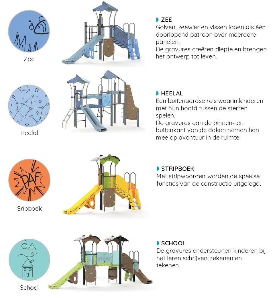 Diabolo biedt je tal van mogelijkheden om een speelplek samen te stellen die perfect aansluit op jouw wensen. Dankzij 8 standaard themawerelden heb je een stevige basis, maar je bepaalt zelf hoe ver je gaat in uitstraling en detail. Met gegraveerde en bedrukte decoraties, extra opties en slimme combinaties maak je het ontwerp uniek. Zo bouw je een speelplek die opvalt, klopt met de omgeving en een blijvende indruk achterlaat.