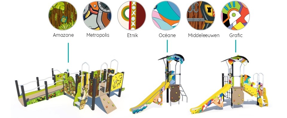 Grafic Games is onze unieke decoratieve techniek waarmee speeltoestellen worden gepersonaliseerd. Grafic Games biedt zes thema’s. Elk thema heeft een eigen stijl en kleurenschema, van diepblauwe oceanen tot een bruisende middeleeuwse markt.