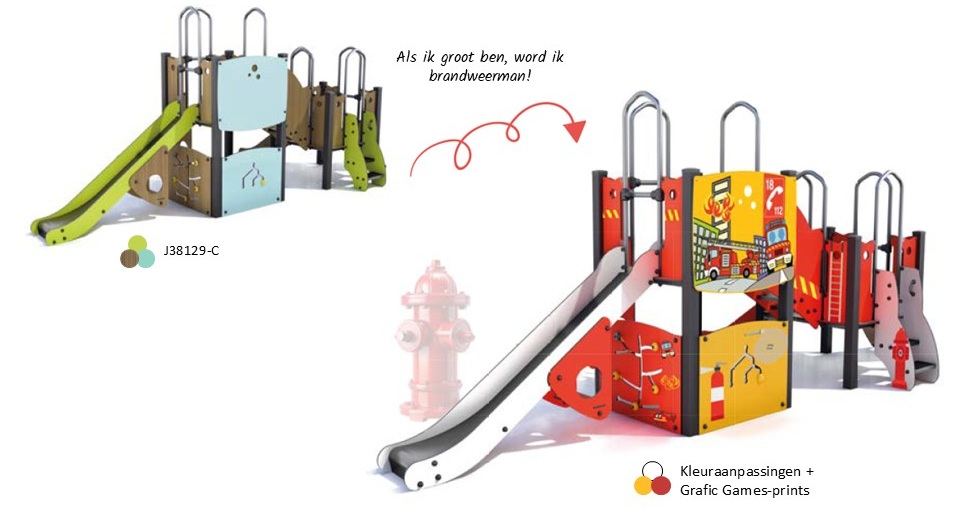 Diabolo is modulair ontworpen, zodat jij een speelwereld bouwt met karakter. Je bent volledig vrij in het ontwerp: van een eigen logo op het toestel tot een compleet thema, zoals de brandweer. Elke module kun je naar wens personaliseren, zodat jouw speelomgeving klopt tot in de kleinste details. Wil je een ander kleurenschema? Kies dan jouw favoriete combinatie uit de kleuren in onze kleurenkaart.