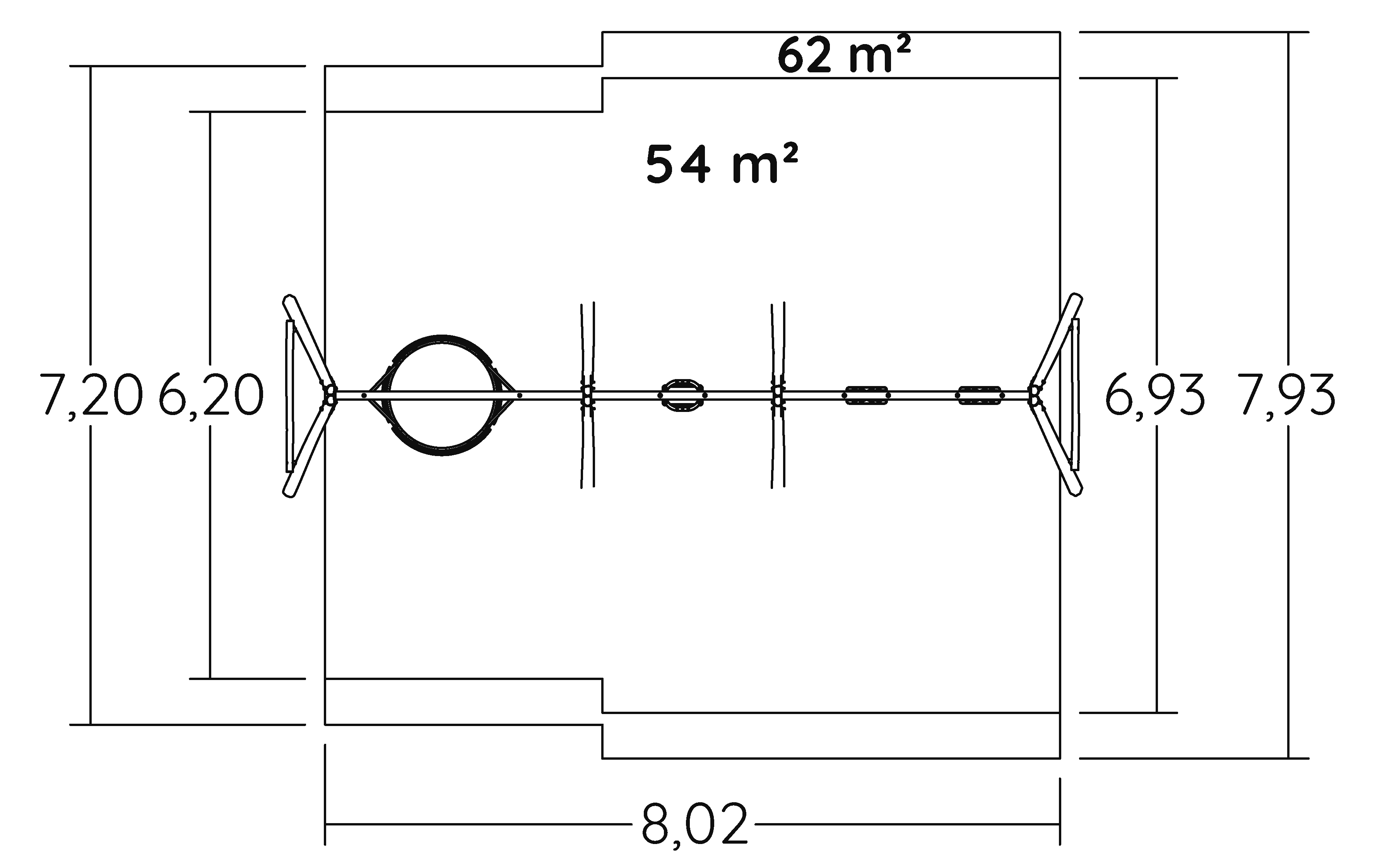 De afmetingen van de module zijn: 8,72 m lengte, 2,21 m breed, 2,60 m hoog. De vrije valhoogte (HCL) is 1,55 m.