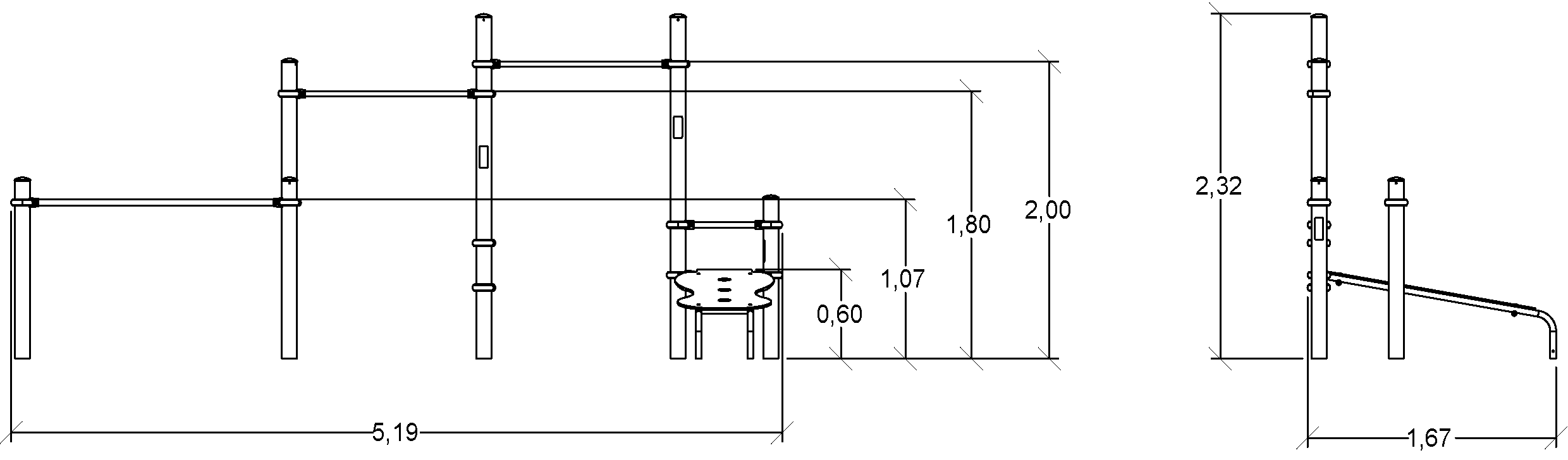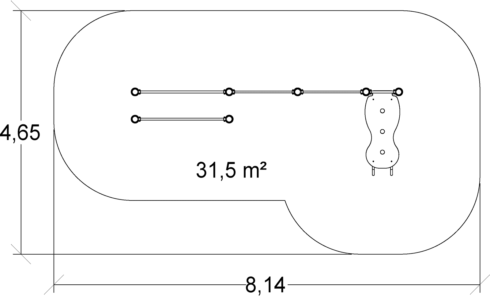 De afmetingen van de module zijn: 5,19 m lengte, 1,67 m breed, 2,32 m hoog. De vrije valhoogte (HCL) is 1,10 m.