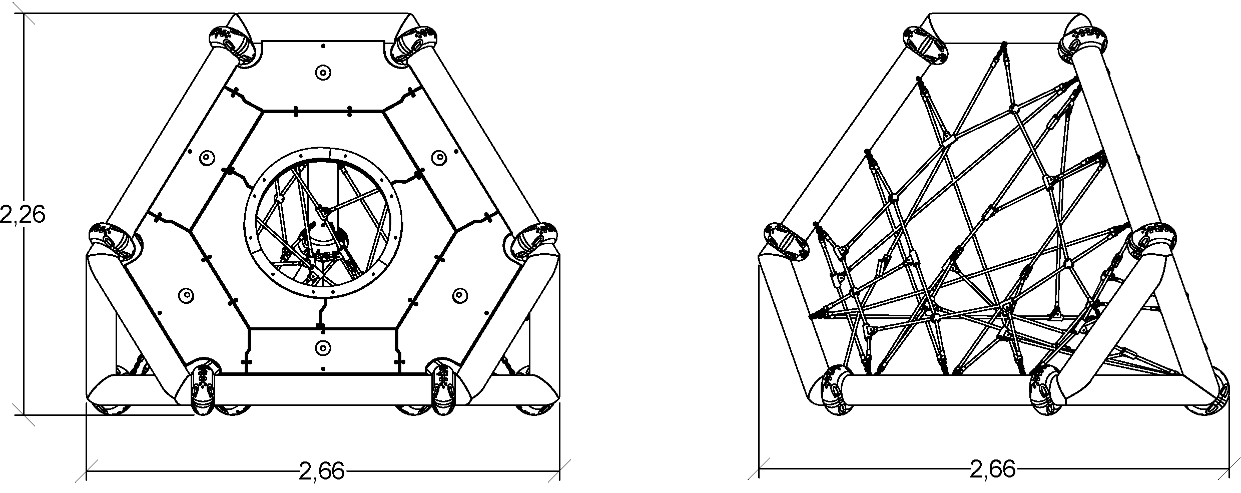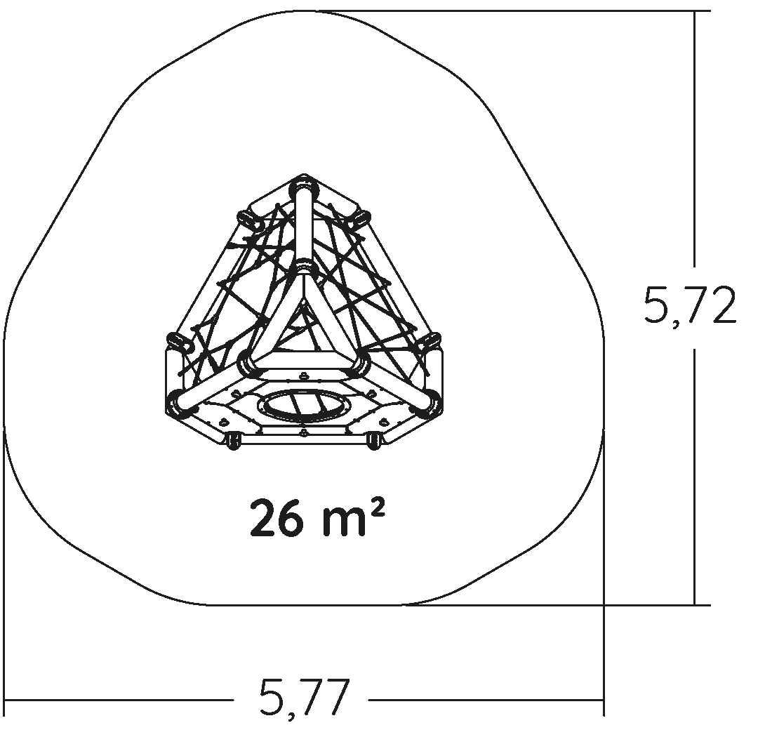 De afmetingen van de module zijn: 2,66 m lengte, 2,66 m breed, 2,26 m hoog. De vrije valhoogte (HCL) is 2,00 m.