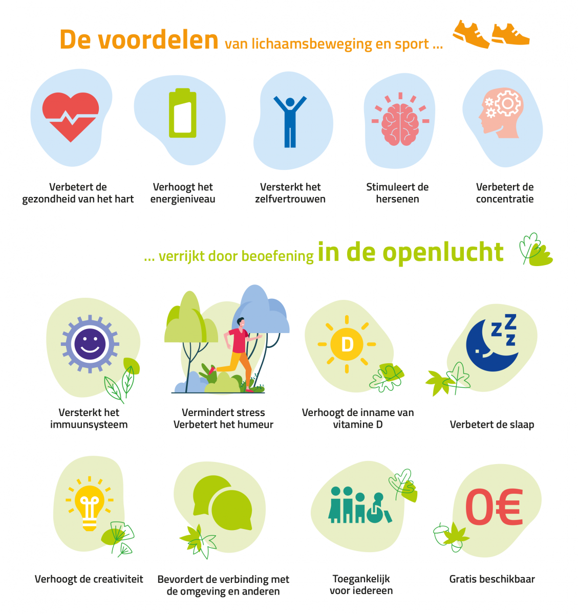 Bewegen in de buitenruimte versterkt de positieve effecten van sport. Het heeft niet alleen fysieke voordelen, maar draagt ook bij aan mentaal welzijn en sociale verbinding. Zo helpt buiten bewegen bij het verbeteren van de conditie en het versterken van het hart. Tegelijkertijd verlaagt het stress, verhoogt het de energie en draagt het bij aan een beter humeur. Ook de concentratie en creativiteit nemen toe.